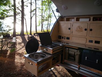 Quick set up and take down: Thanks to a fully in place kitchen and three heavy duty outriggers, Dream Catcher teardrop trailers are a breeze to set up and take down.